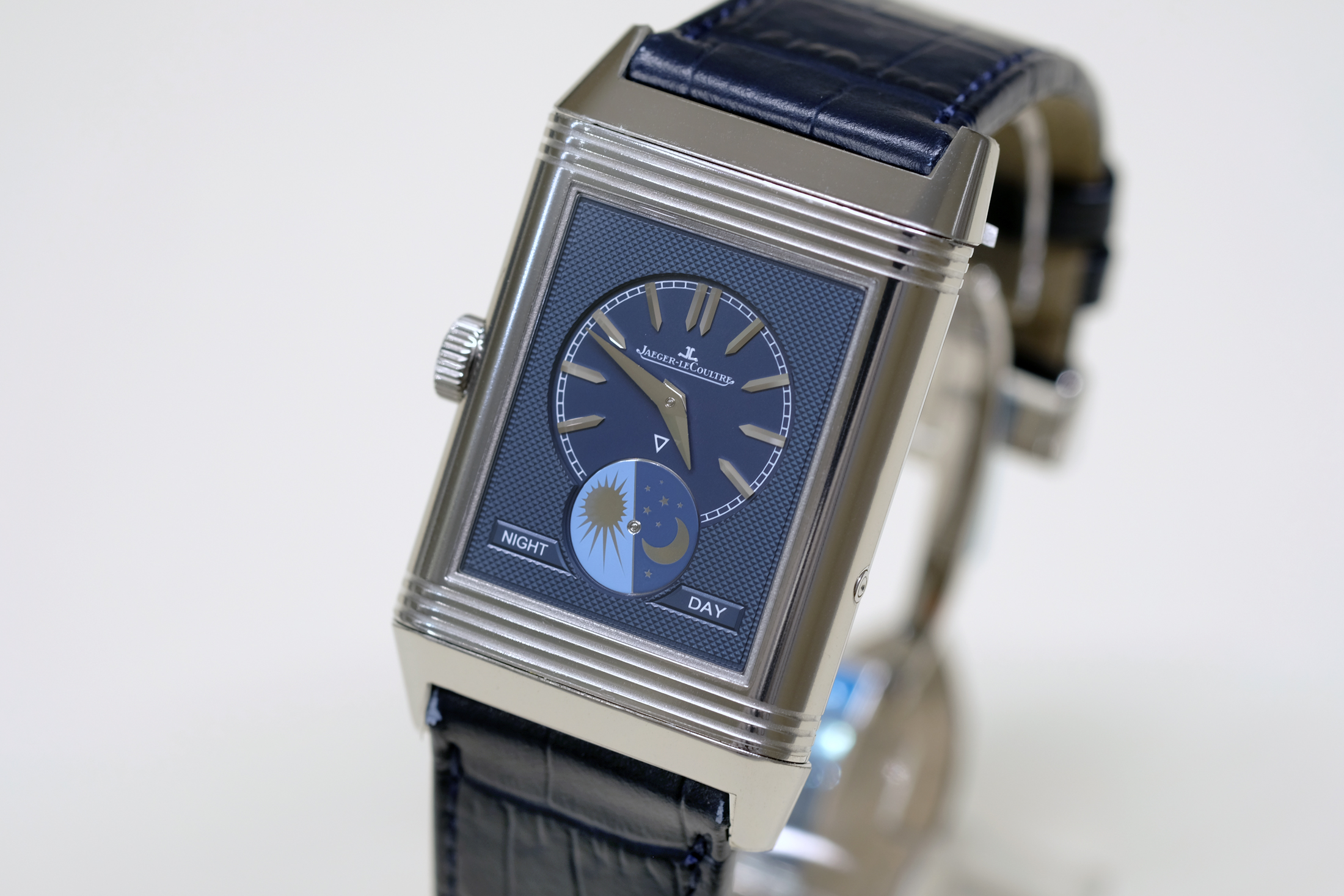 ジャガー・ルクルトはまた、この時計のセカンドタイムゾーンを表示する裏面を(これは通常、旅先でホーム時刻をキープしておくためのもの)美しいブルーのダイヤルにしている。これは、ジャガー・ルクルトの中では非常にモダンな色合いで、実にうまくマッチしている。表面の乳白色のダイヤルと裏面のクル・ド・パリのダイヤルのコントラストが素晴らしいのだ。6時位置には2種類の青を使った昼夜表示があり、アプライドインデックスとポリッシュ仕上げの針がついている。シャネル時計j12これは魅力的な組み合わせを、個人的にとても気に入っている。